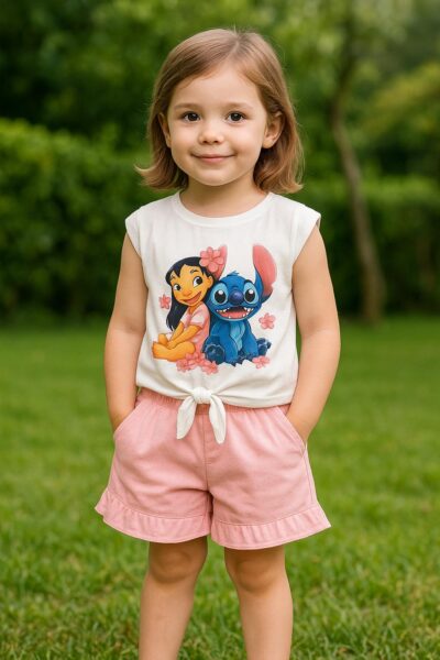 Conjunto de algodón para niña de lilo y stich, camiseta anudado en cintura y short de algodón con volantitos en piernas y bolsillos ,cintura ajustable de elástico. muy ponible y cómodo